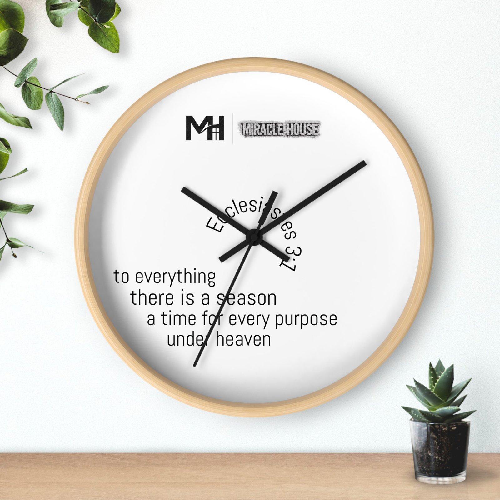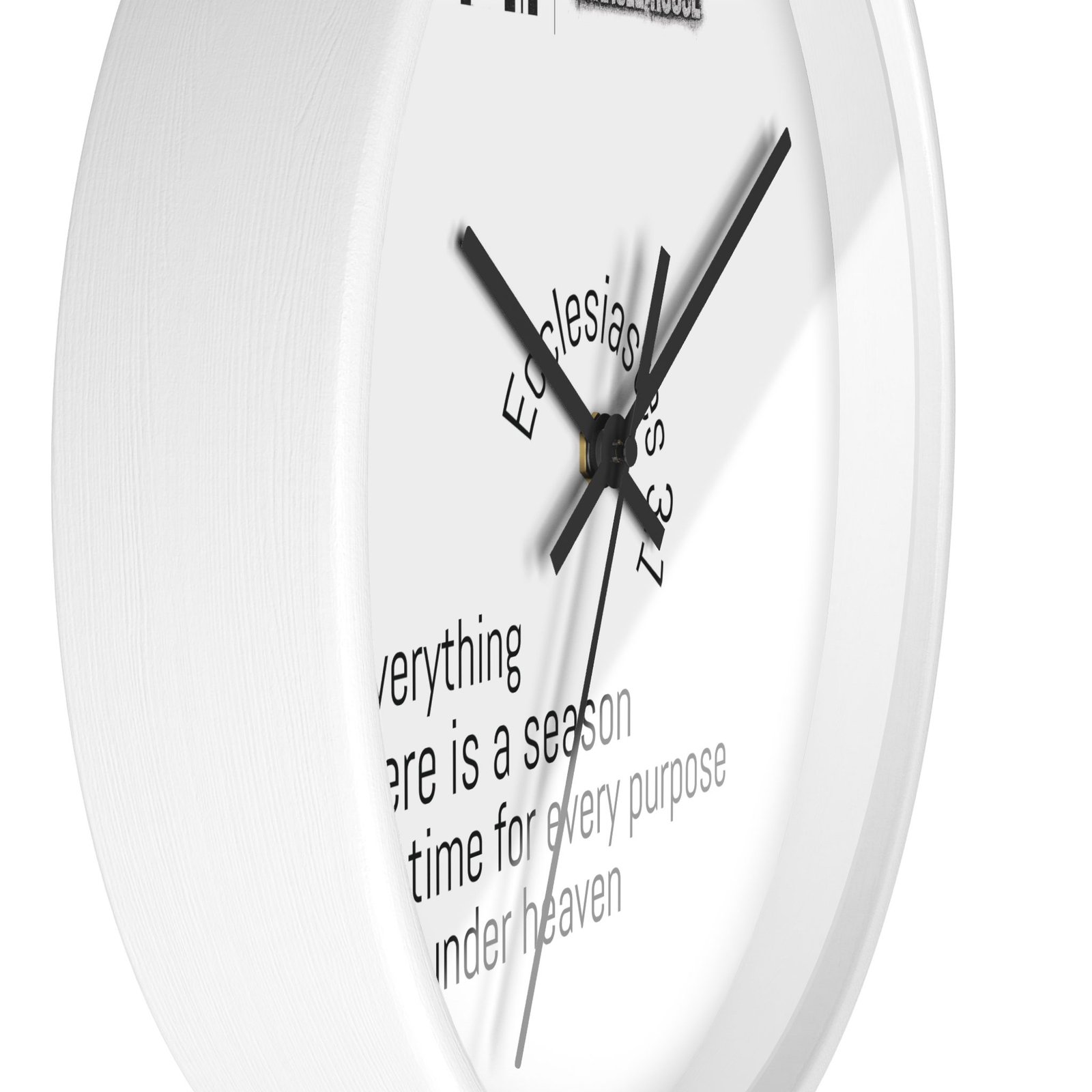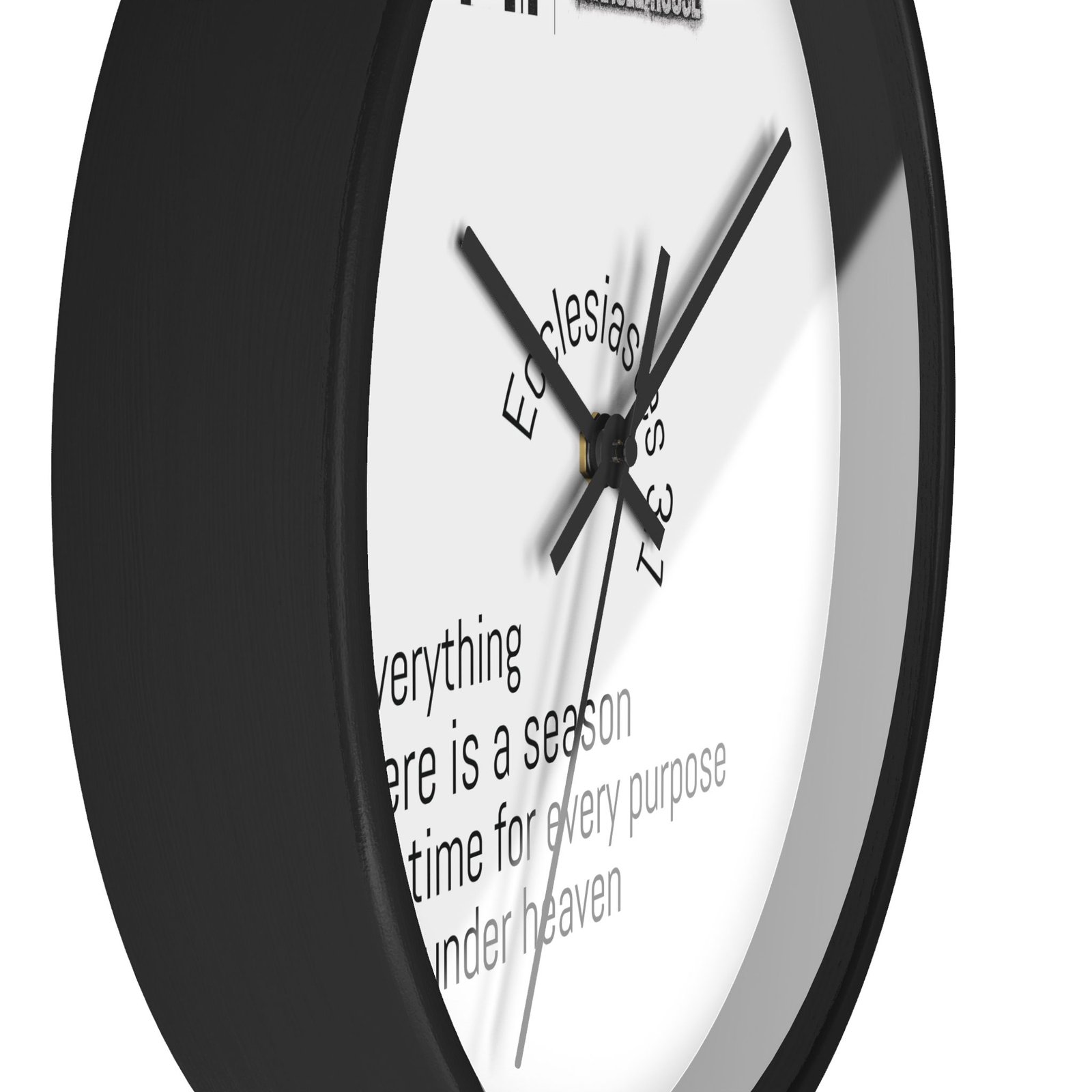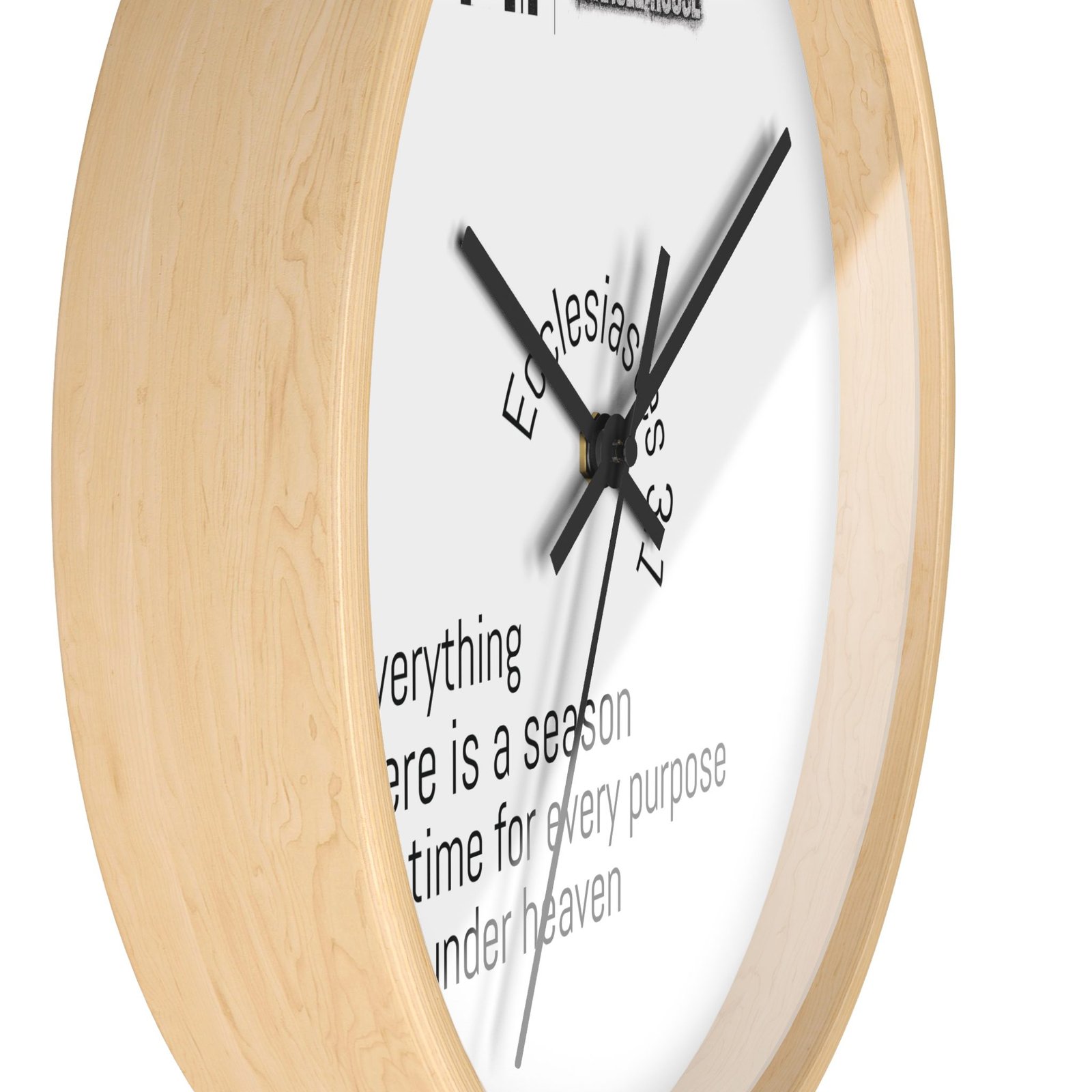This 10" wall clock brings quiet, contemplative grace to any room. Clean black hands sweep over a minimalist white face printed with the evocative Ecclesiastes 3:1 verse, arranged in a subtle spiral that draws the eye and invites a moment of pause. The slim wood frame and plexiglass face give a light, modern profile that sits calmly on a living room wall, hallway, or cozy reading nook. The silent mechanism keeps ticking unobtrusive — time moves, but the room stays peaceful. Choose black, white, or natural wood frame and matching hands to blend with your décor. Hang easily with the pre-installed hook and power with a single AA battery.