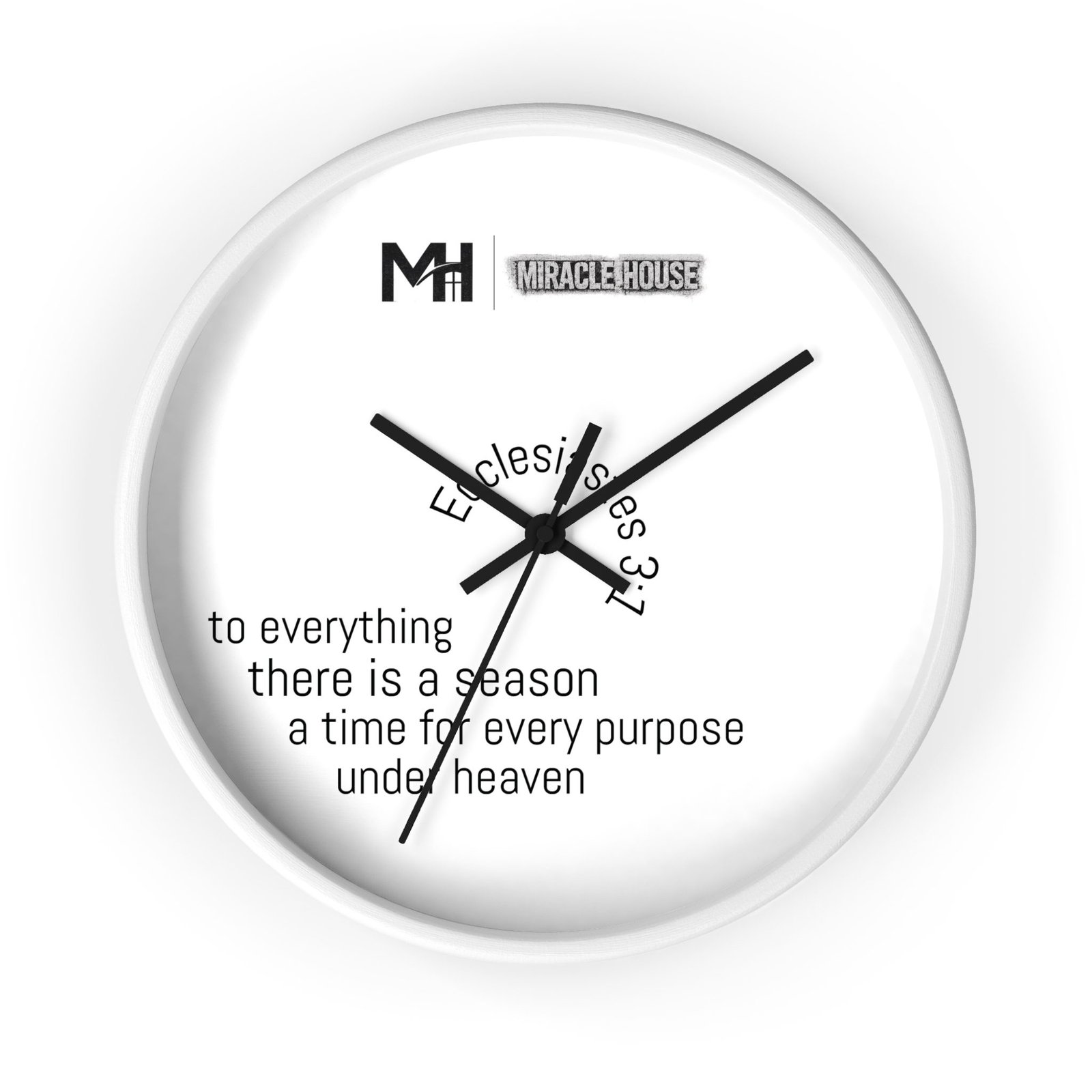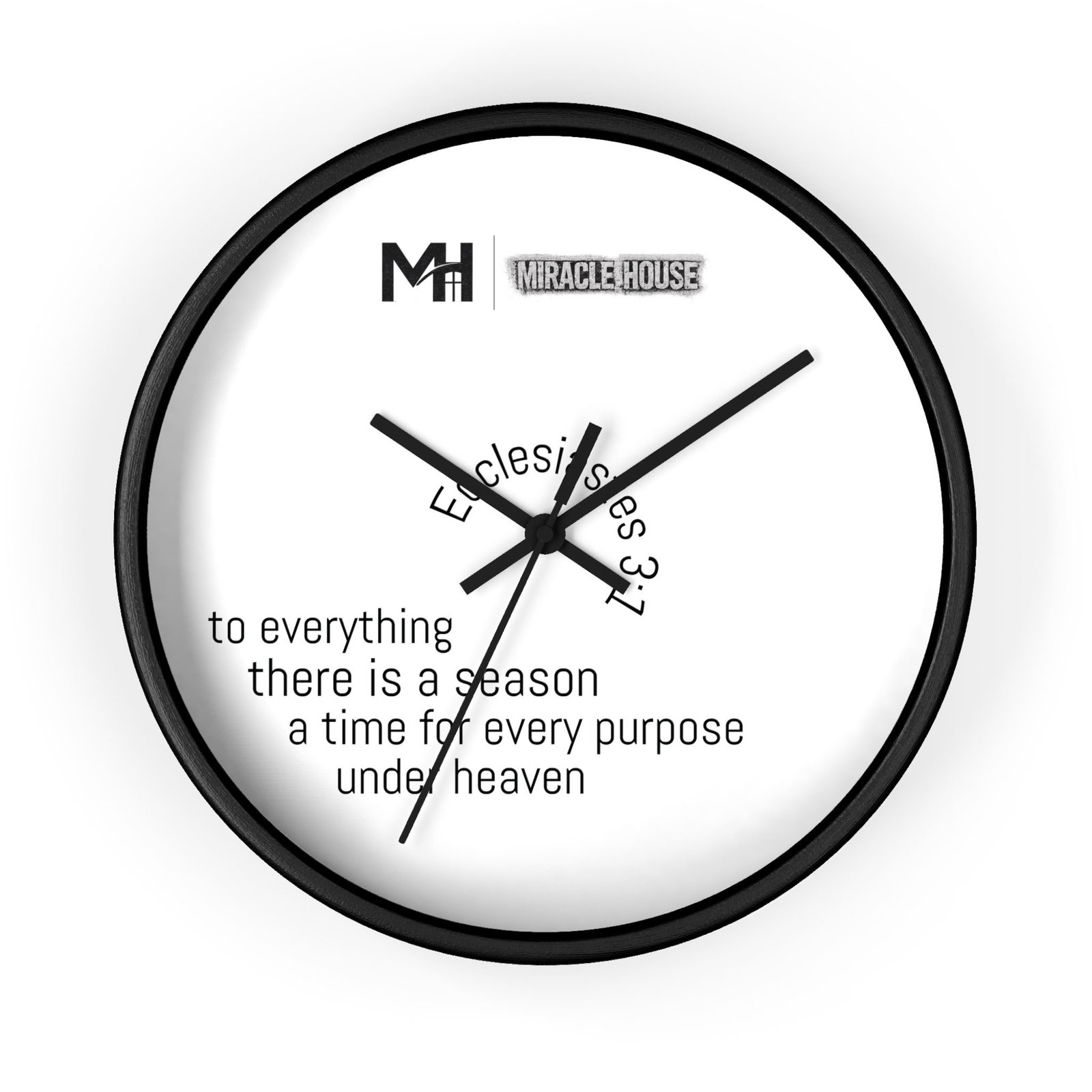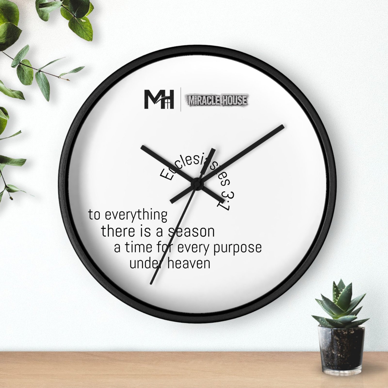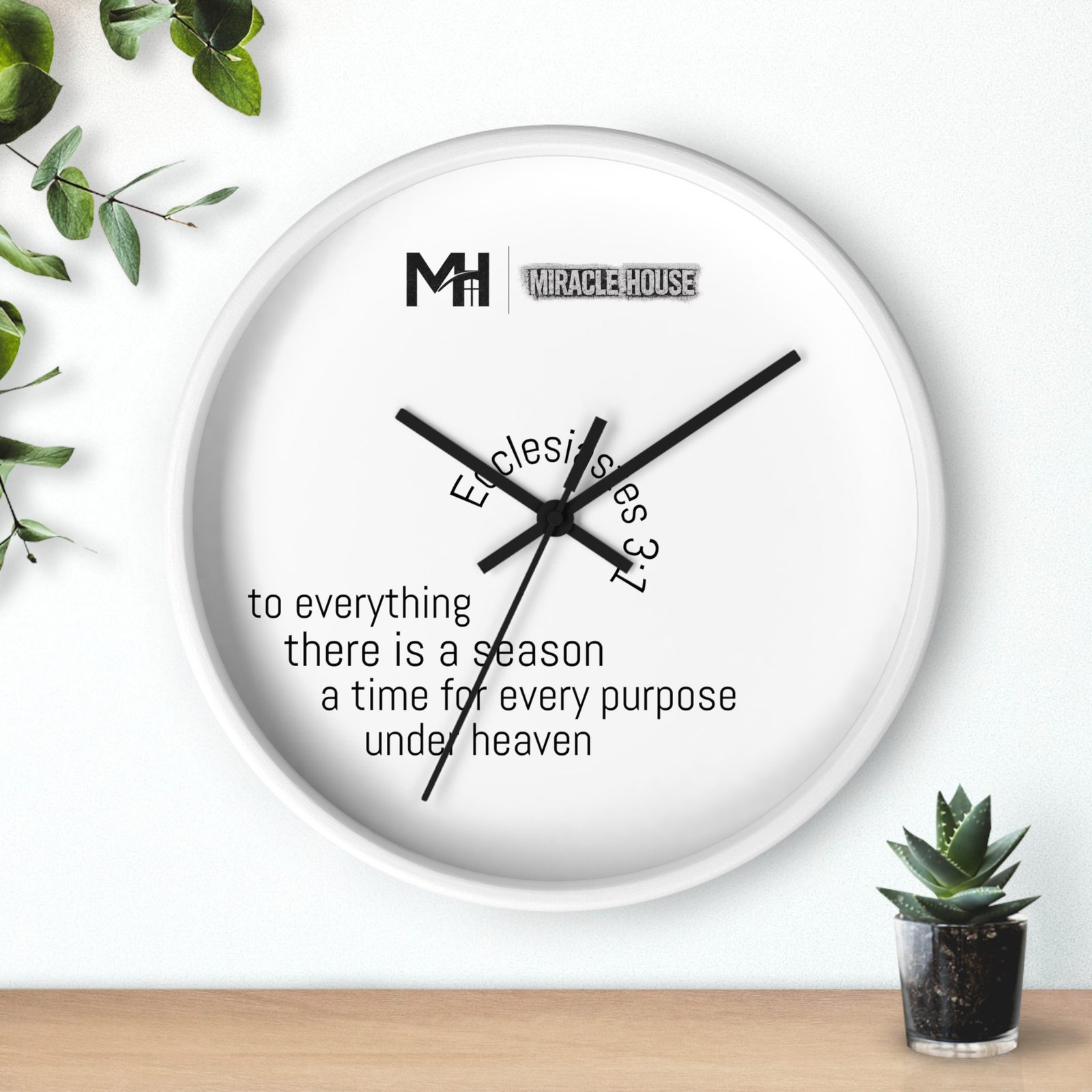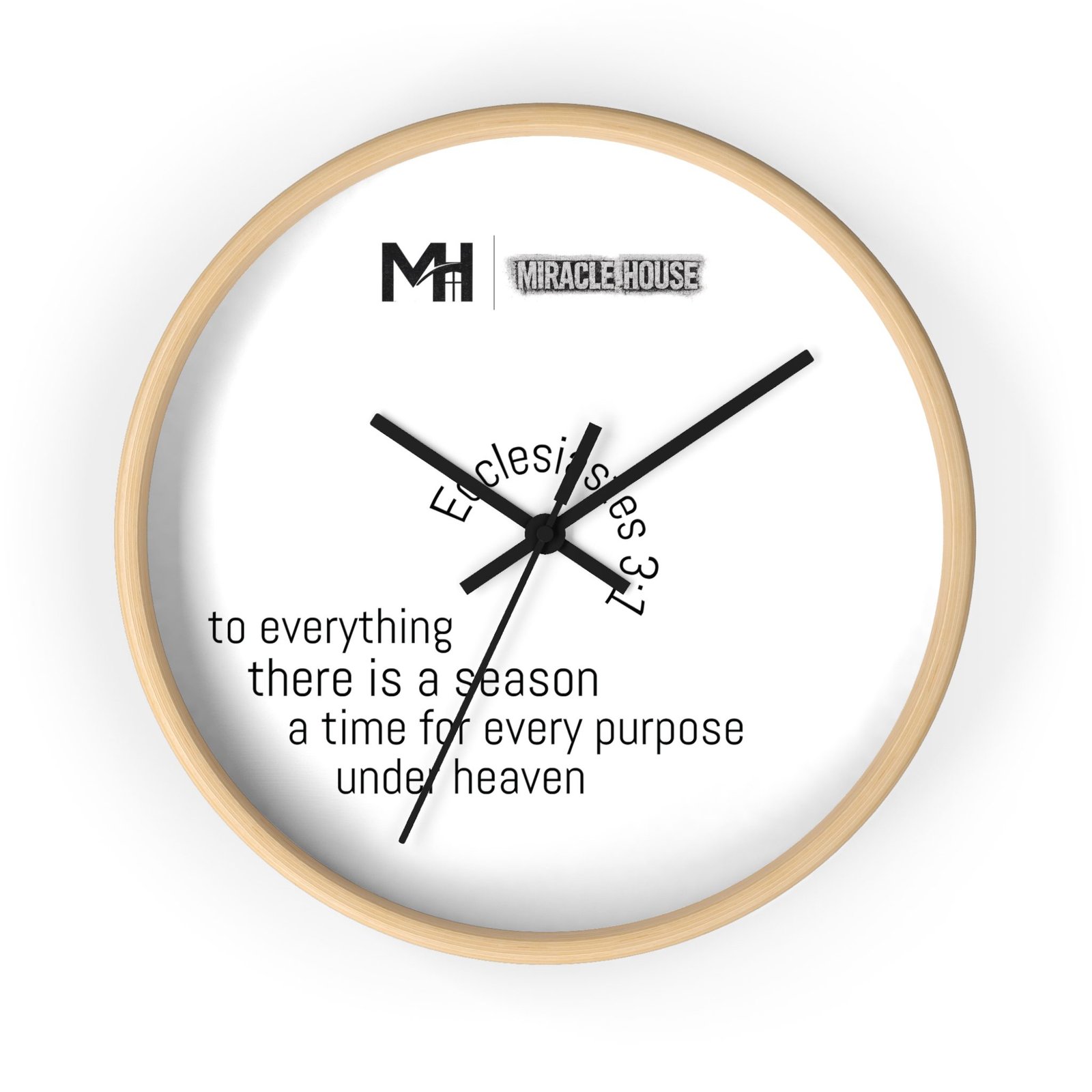 This 10" wall clock brings quiet, contemplative grace to any room. Clean black hands sweep over a minimalist white face printed with the evocative Ecclesiastes 3:1 verse, arranged in a subtle spiral that draws the eye and invites a moment of pause. The slim wood frame and plexiglass face give a light, modern profile that sits calmly on a living room wall, hallway, or cozy reading nook. The silent mechanism keeps ticking unobtrusive — time moves, but the room stays peaceful. Choose black, white, or natural wood frame and matching hands to blend with your décor. Hang easily with the pre-installed hook and power with a single AA battery.